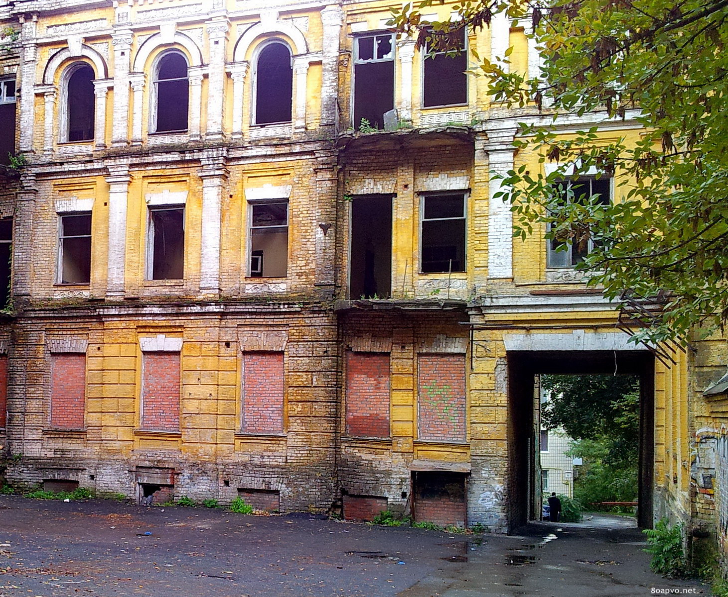 Зайдя в арку, мы увидим второе разрушающееся здание знаменитого дома Сикорских. Это здание интересно не только тем, что в этом доме жил киевский врач, меценат Сикорский и его сын, талантливейший авиаконструктор Игорь, но и тем, что в этом здании сразу после освобождения Киева от немецких захватчиков размещался штаб 7-го корпуса ПВО.